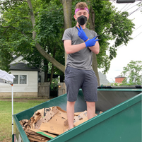 Over on the Personnel Dept. page, there are pictures of volunteers taken at various distributions over the Pantry year. Not pictured, however, is a vital activity that only the very elite of the volunteer cadre are allowed to participate in. The training is hard and unforgiving, and not everyone makes it. Frankly, it is helpful if you are prepared to put on a few pounds. Either that, or be able to jump really high. F = MA, or Newton's Second Law of Motion, applied to the physics of cardboard compression in a confined space. Dumpster trampolining, if you will. Here are some pictures of the few who made the grade.